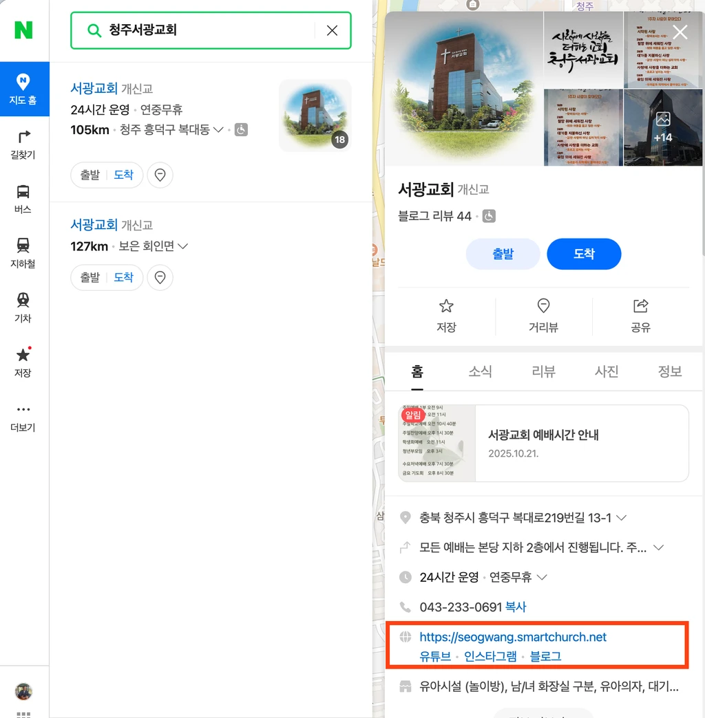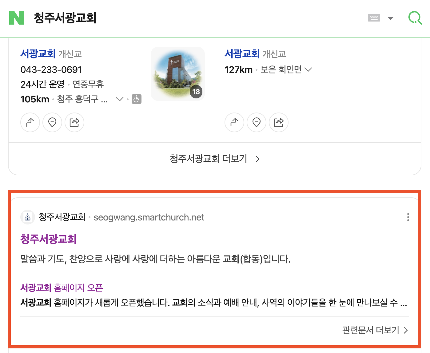 스마트처치에서 홈페이지를 생성하신 청주서광교회가 네이버 검색 상단에 노출된 모습입니다.