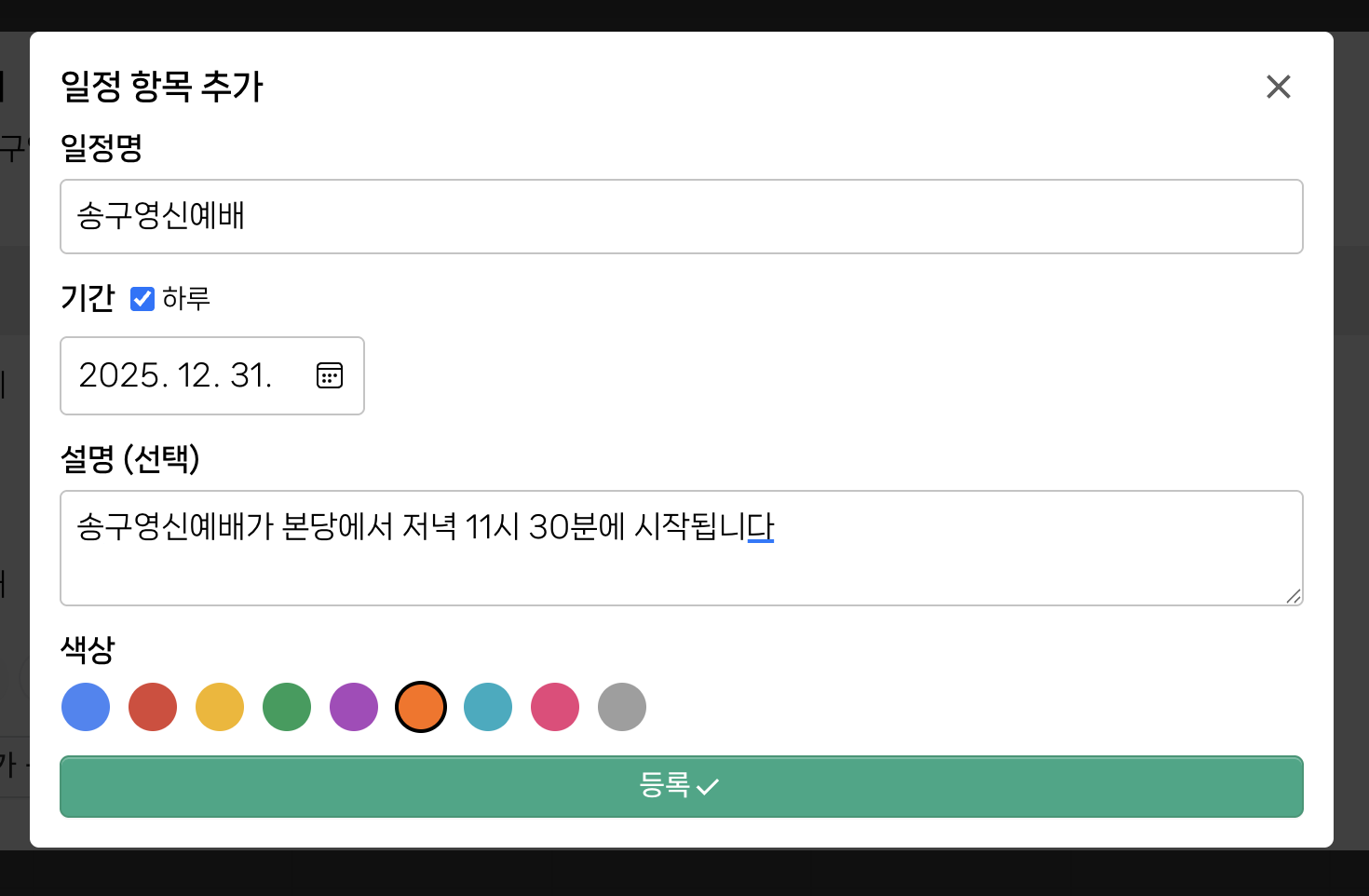 교회의 여러가지 일정들 (세례식, 수련회, 성찬예식 등등)을 등록해보세요~^^