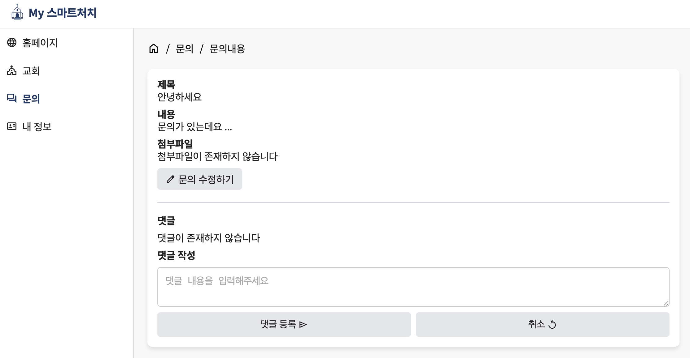 스마트처치 서비스를 이용하시면서 어려운 점이나 오류 같은 것이 있으시면 관리자페이지에서 문의 메뉴를 이용해주시면 답변드리겠습니다~!